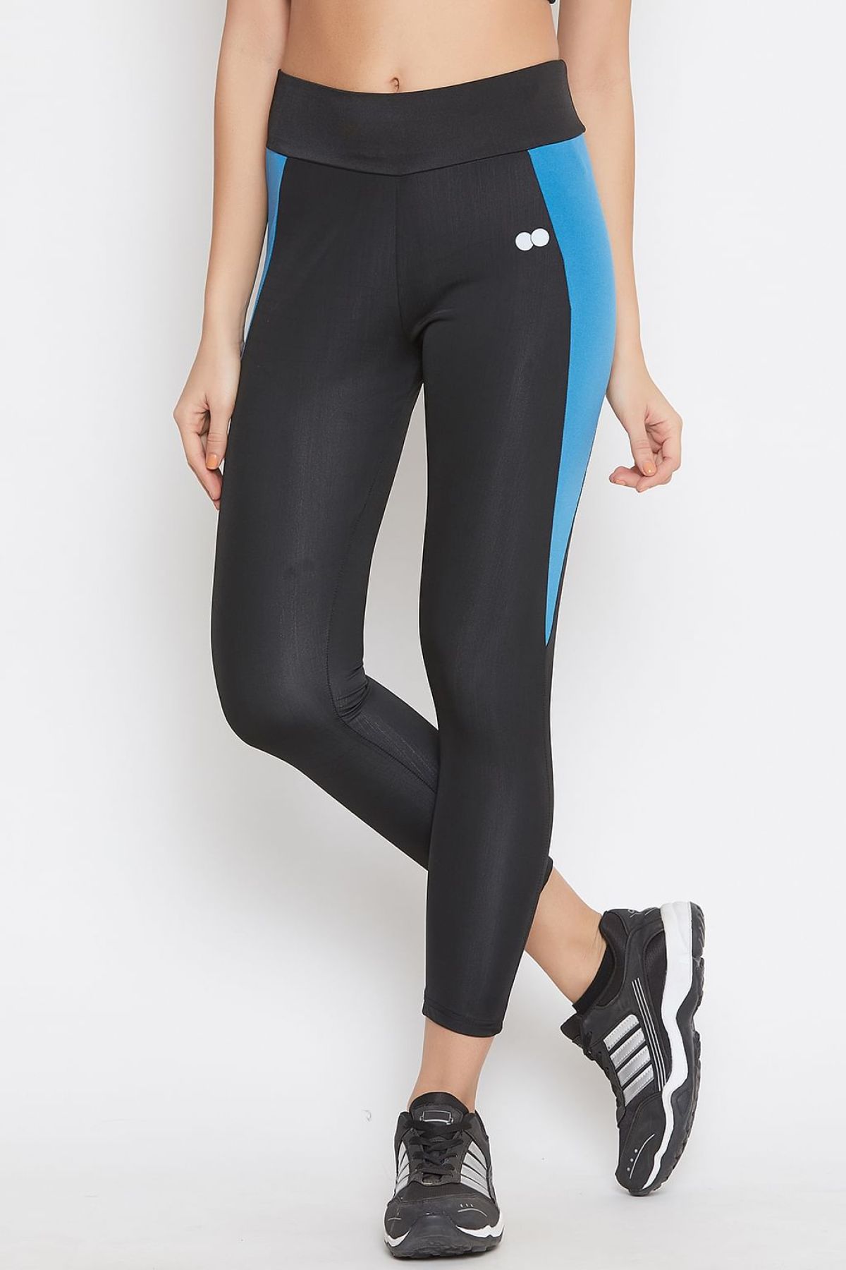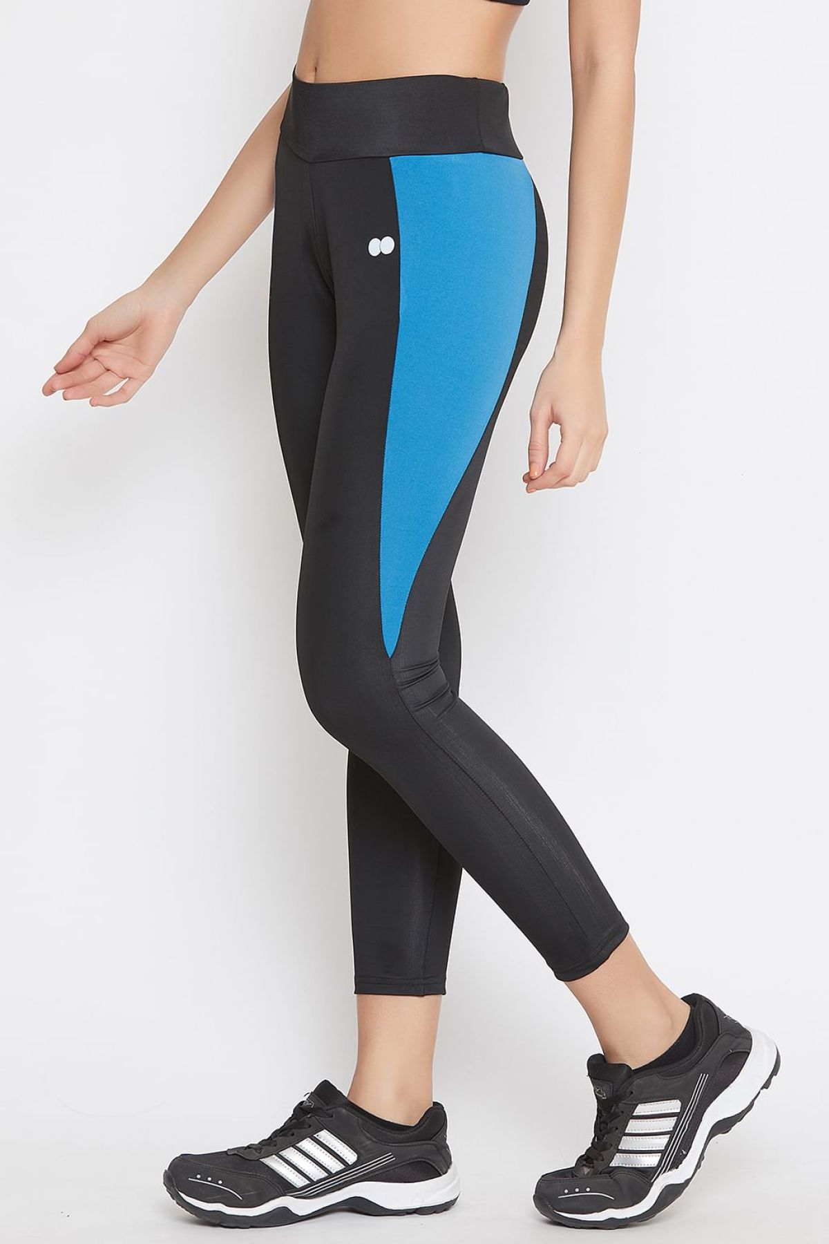 - Black and blue colourblock ankle-length tights crafted with soft moisture wicking polyamide fabric.