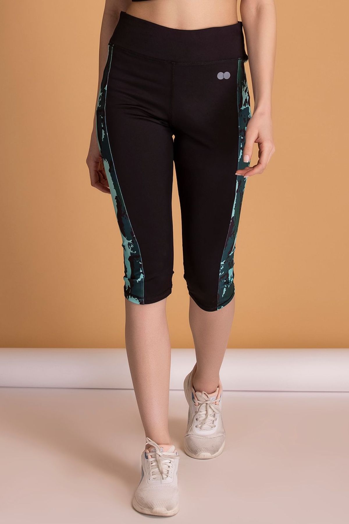 Snug Fit High-Rise Active Capri in Black with Printed Panels