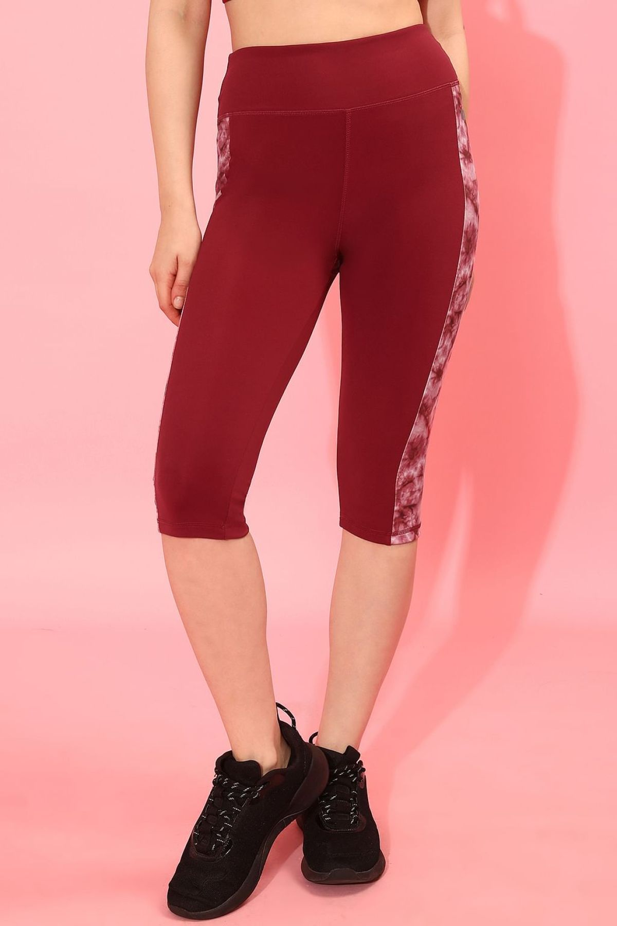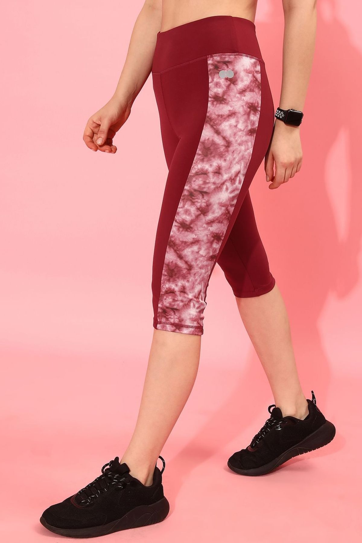 Snug Fit High-Rise Active Capri in Maroon with Printed Panels