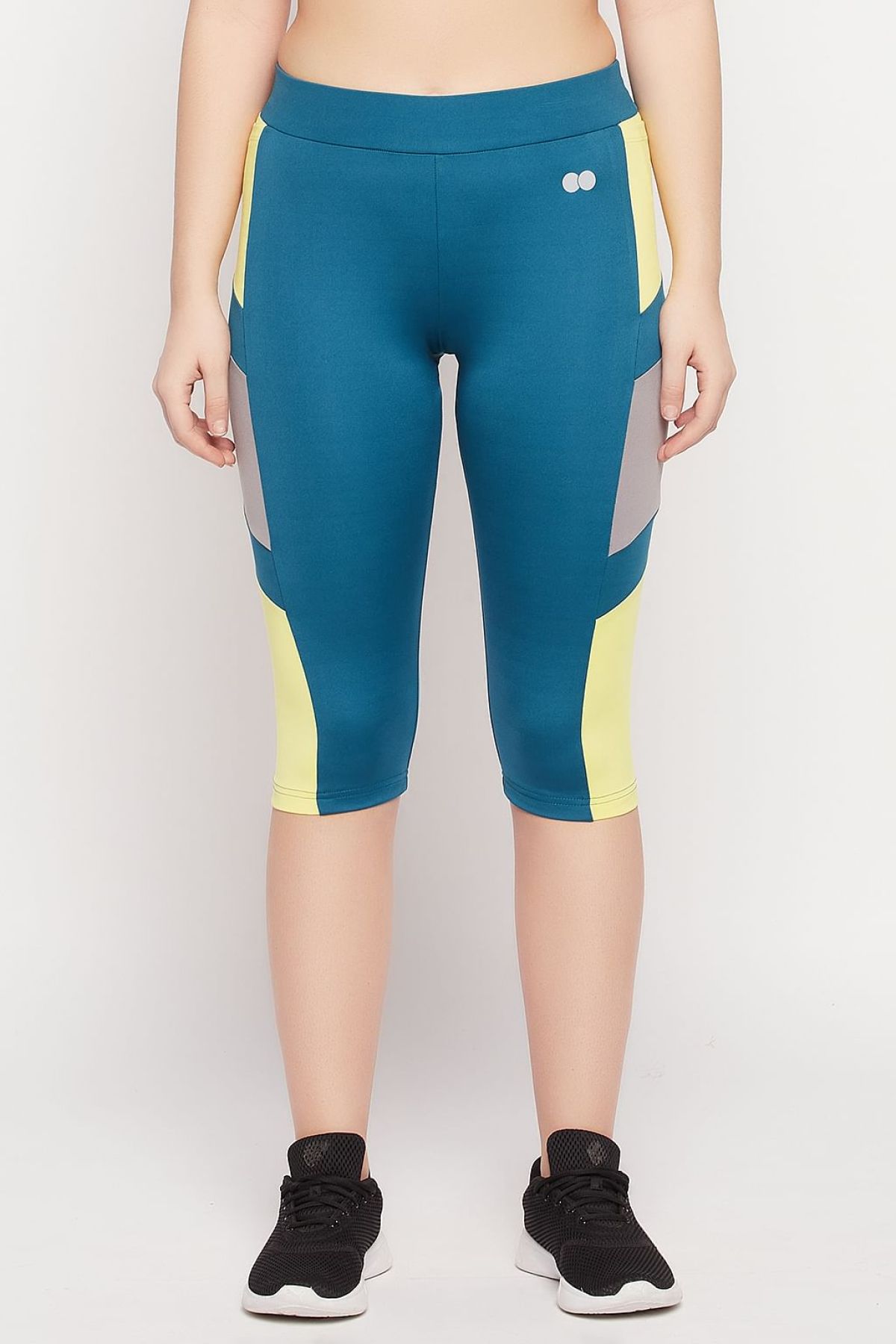 Snug Fit High-Rise Active Capri in Teal Blue with Coloured Panels & Side Pockets