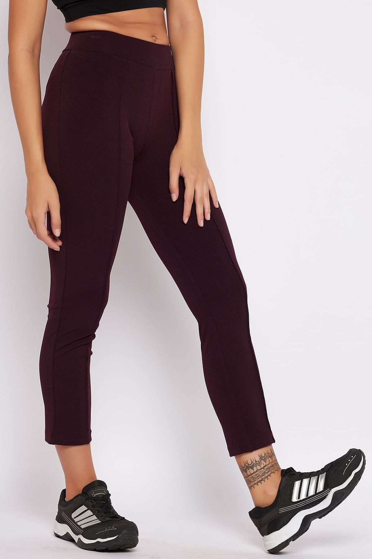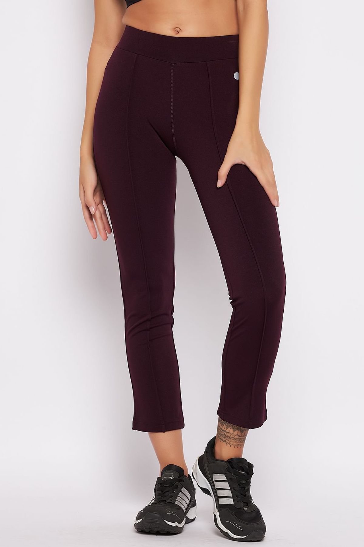 - Plum colour high waist active straight pants crafted with soft poly-spandex fabric.