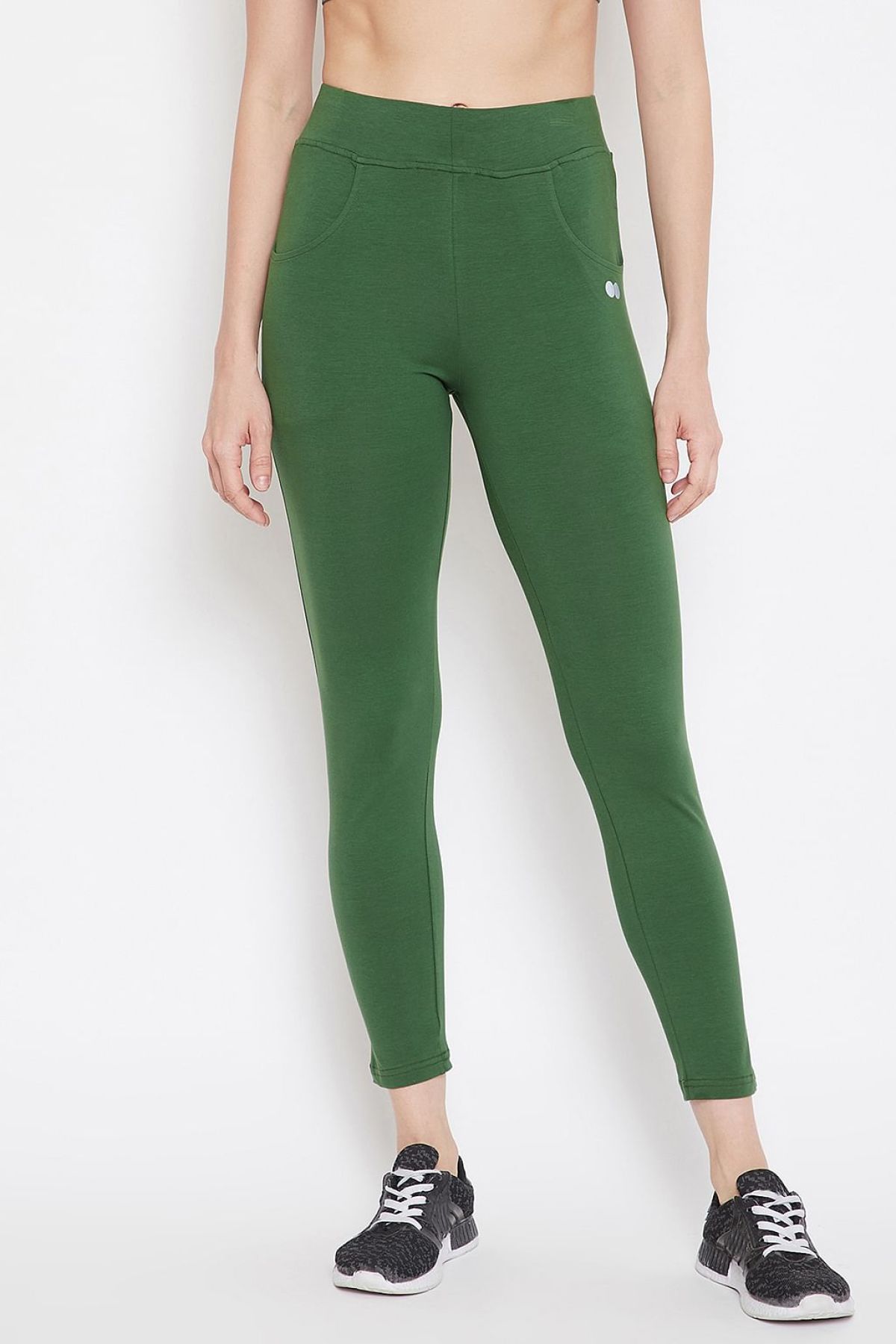 - Green snug fit ankle-length tights crafted with soft and breathable cotton-rich fabric.