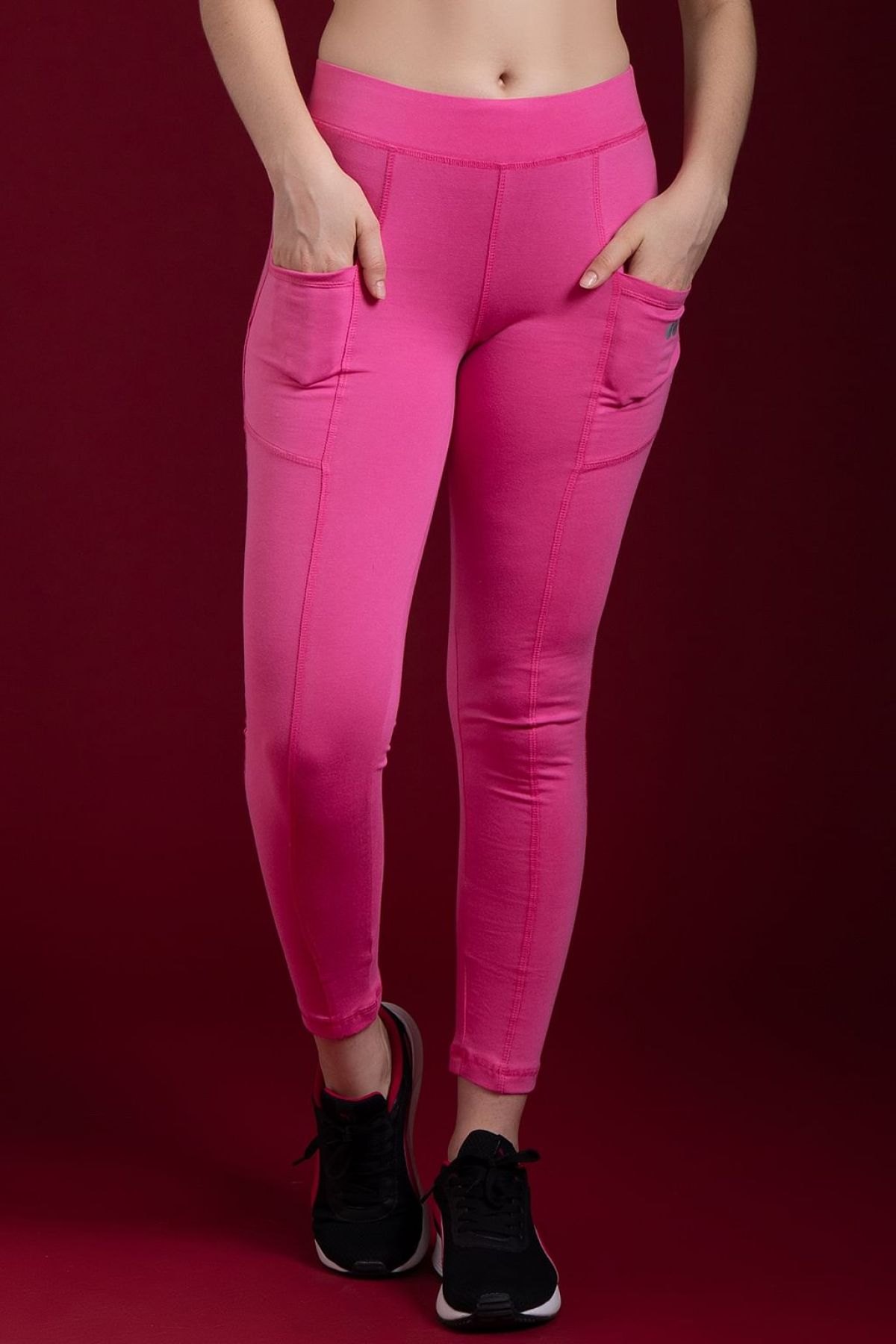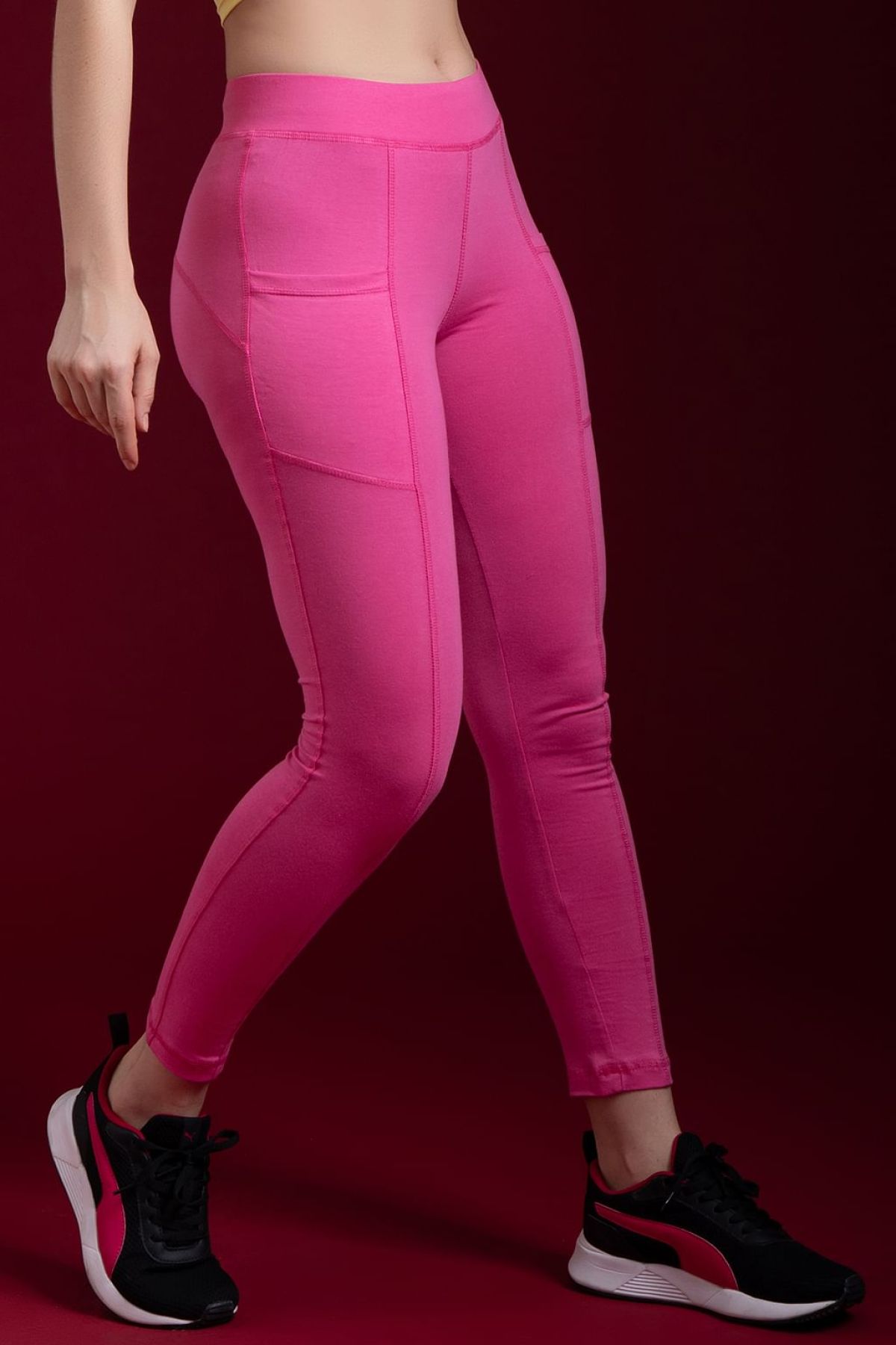 - Hot pink snug fit ankle-length tights crafted in cotton rich fabric with spandex.