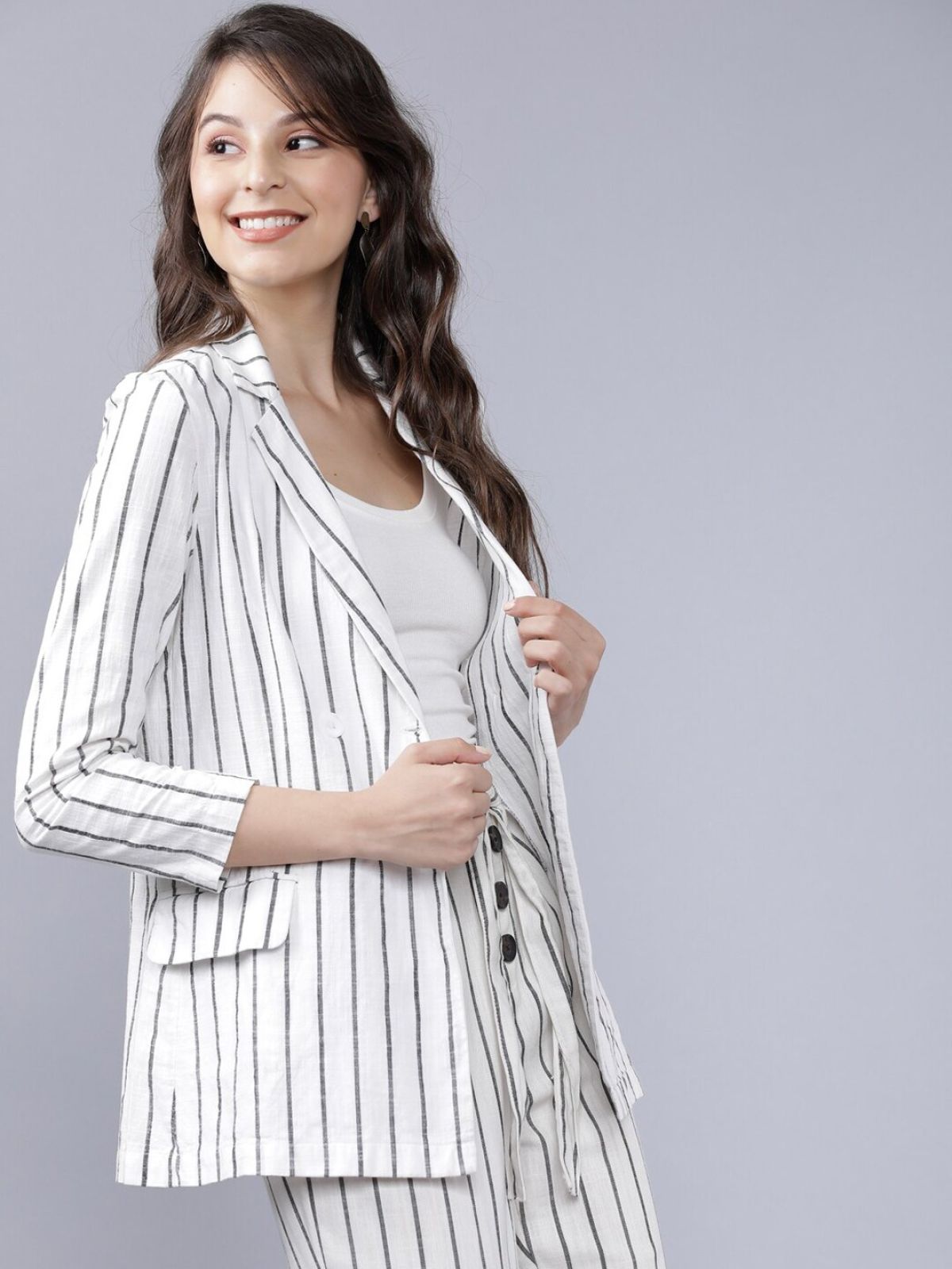 *Check the latest price and availability on the official store.Tokyo Talkies Women Off-White & Grey Striped Double-Breasted Casual Pure Cotton Blazer
