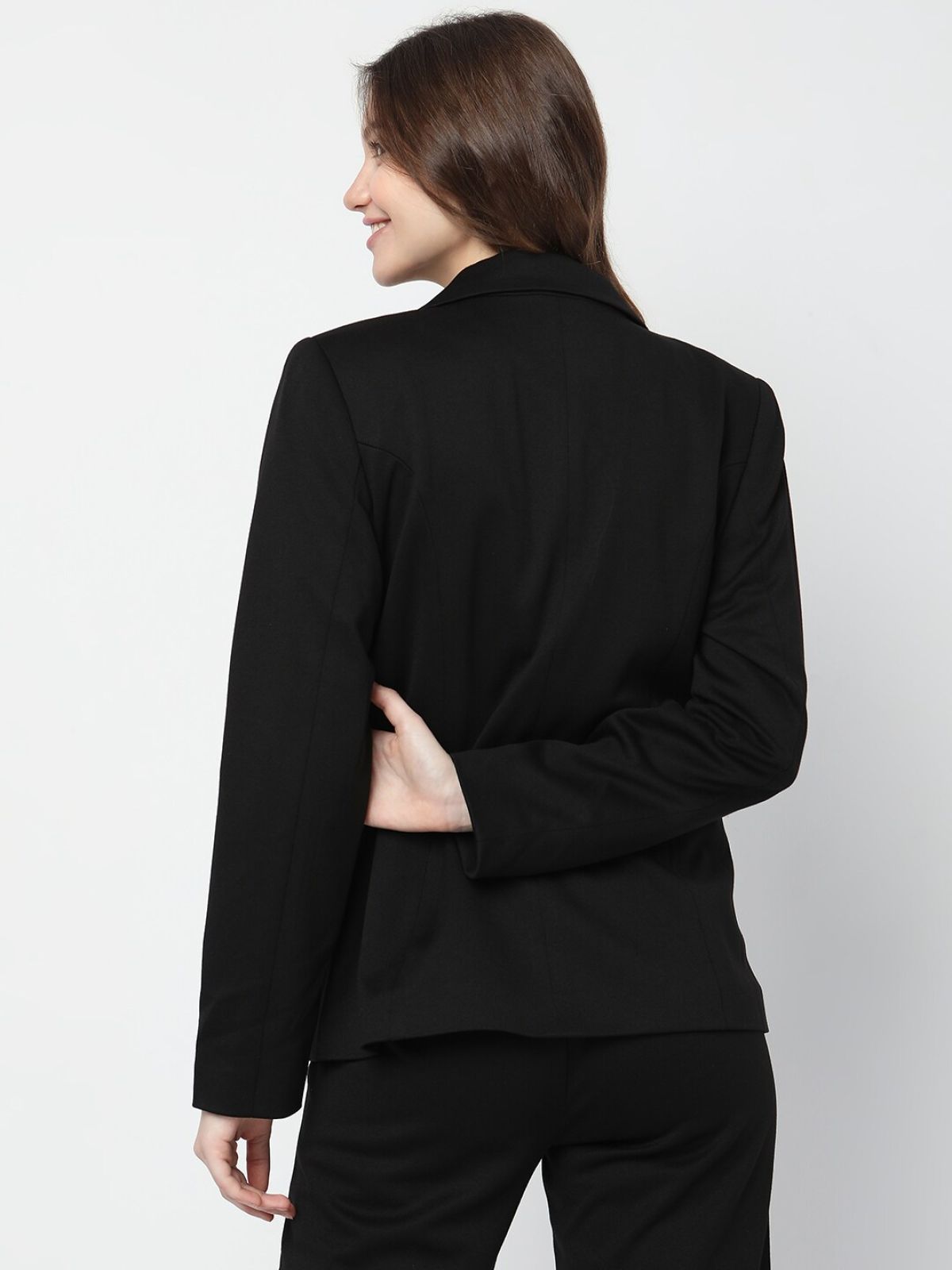 Solid regular-fit single-breasted casual blazer, has a notched lapel collar, button closure, long regular sleeves, two flap pockets and double vented back hem