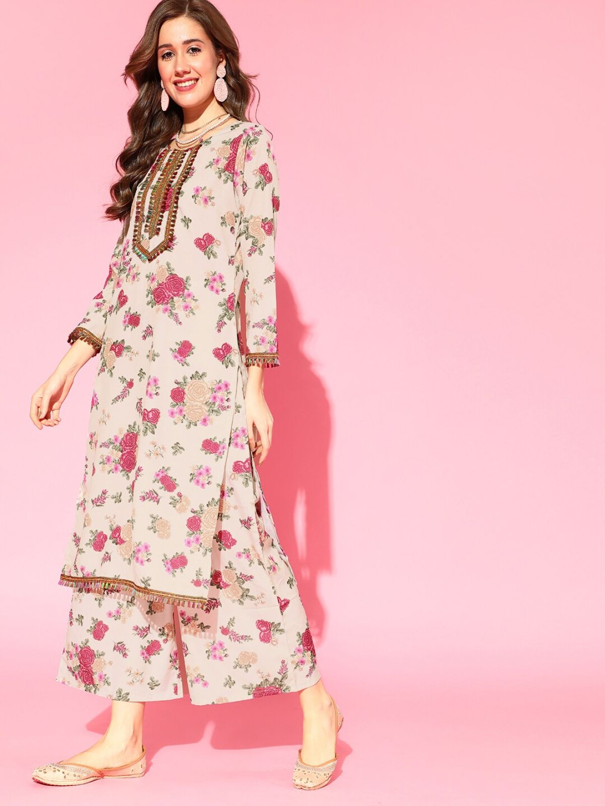 *Check the latest price and availability on the official store.Women Beige Floral Printed Regular Gotta Patti Kurta with Palazzos & With Dupatta (Ahalyaa)