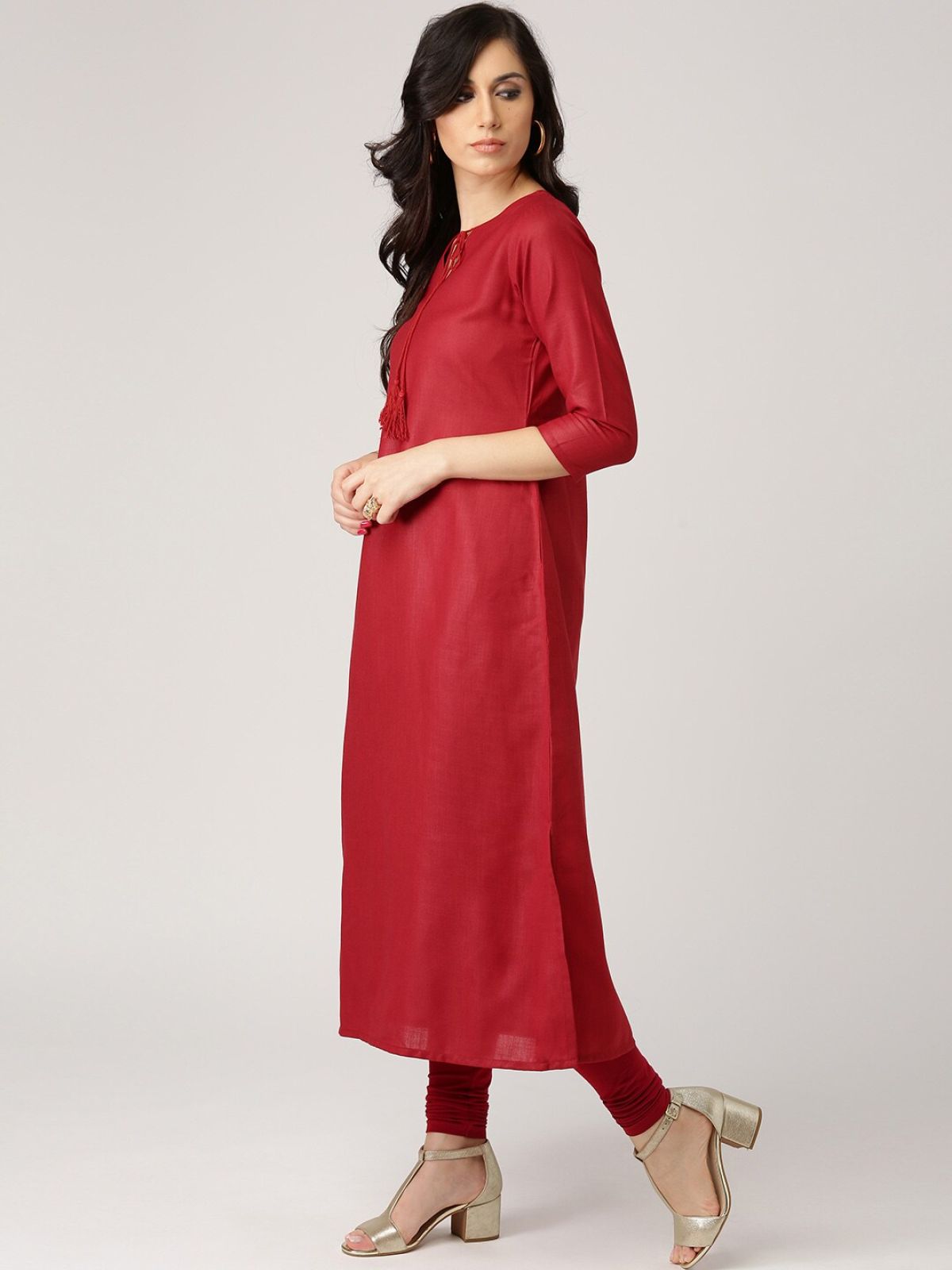 Maroon solid Straight kurta, has a tie-up neck, three-quarter sleeves, straight hem, side slits
